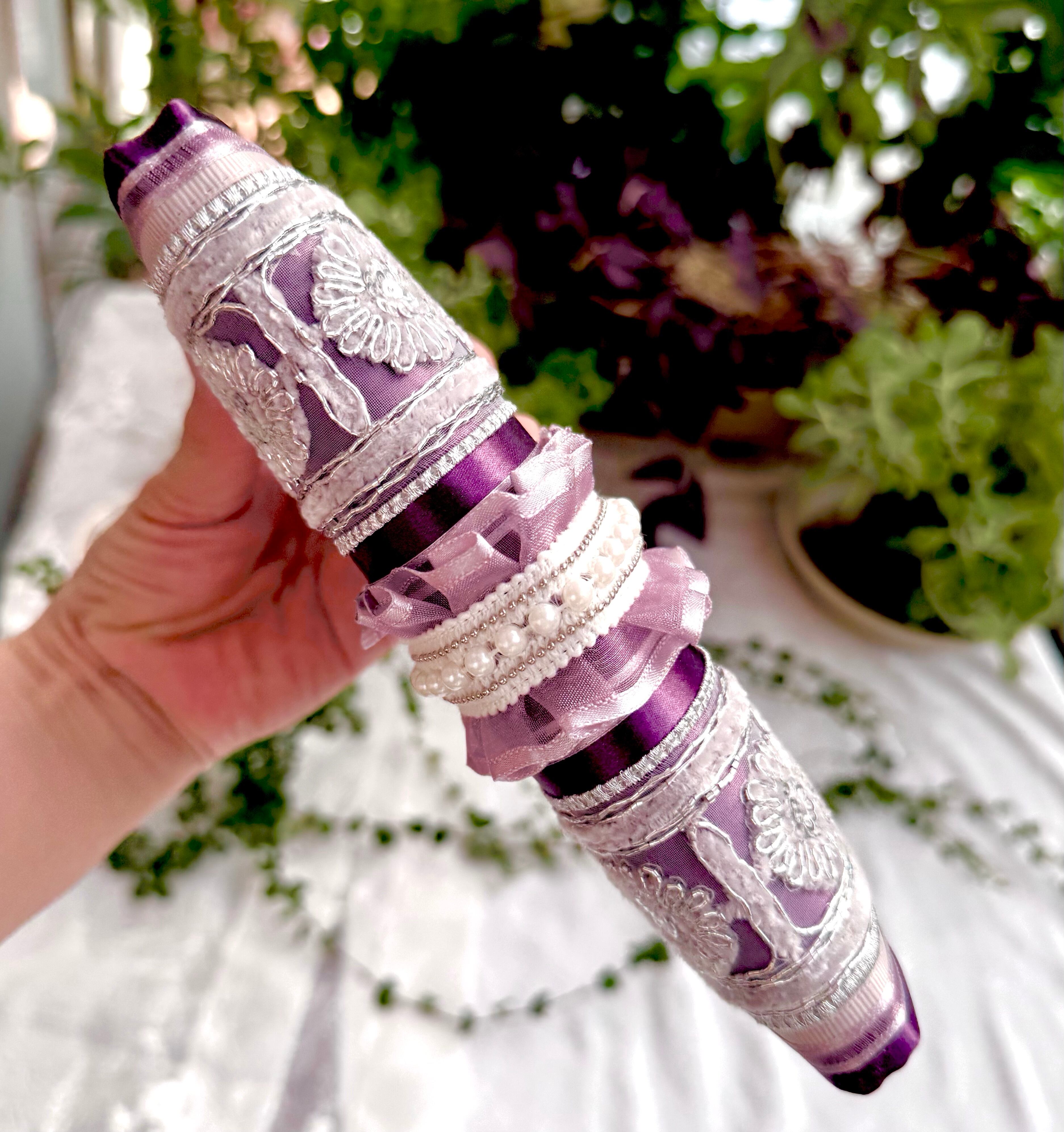 紫は「直感力」や「精神性」を象徴し、持つ人の心を穏やかに導いてくれる色。そこに柔らかな光を透かす淡紫のオーガンジーを添えることで、上品さと華やかさが調和しました。銀糸で咲く花模様は「浄化」と「清らかさ」を表し、凛とした輝きを演出します。落ち着きと華やぎをあわせ持つデザインは、大人の女性の手元に自然に馴染み、特別な日常を彩ってくれるひと品。お財布を開くたびに、自分らしい輝きを思い出させてくれる存在です。