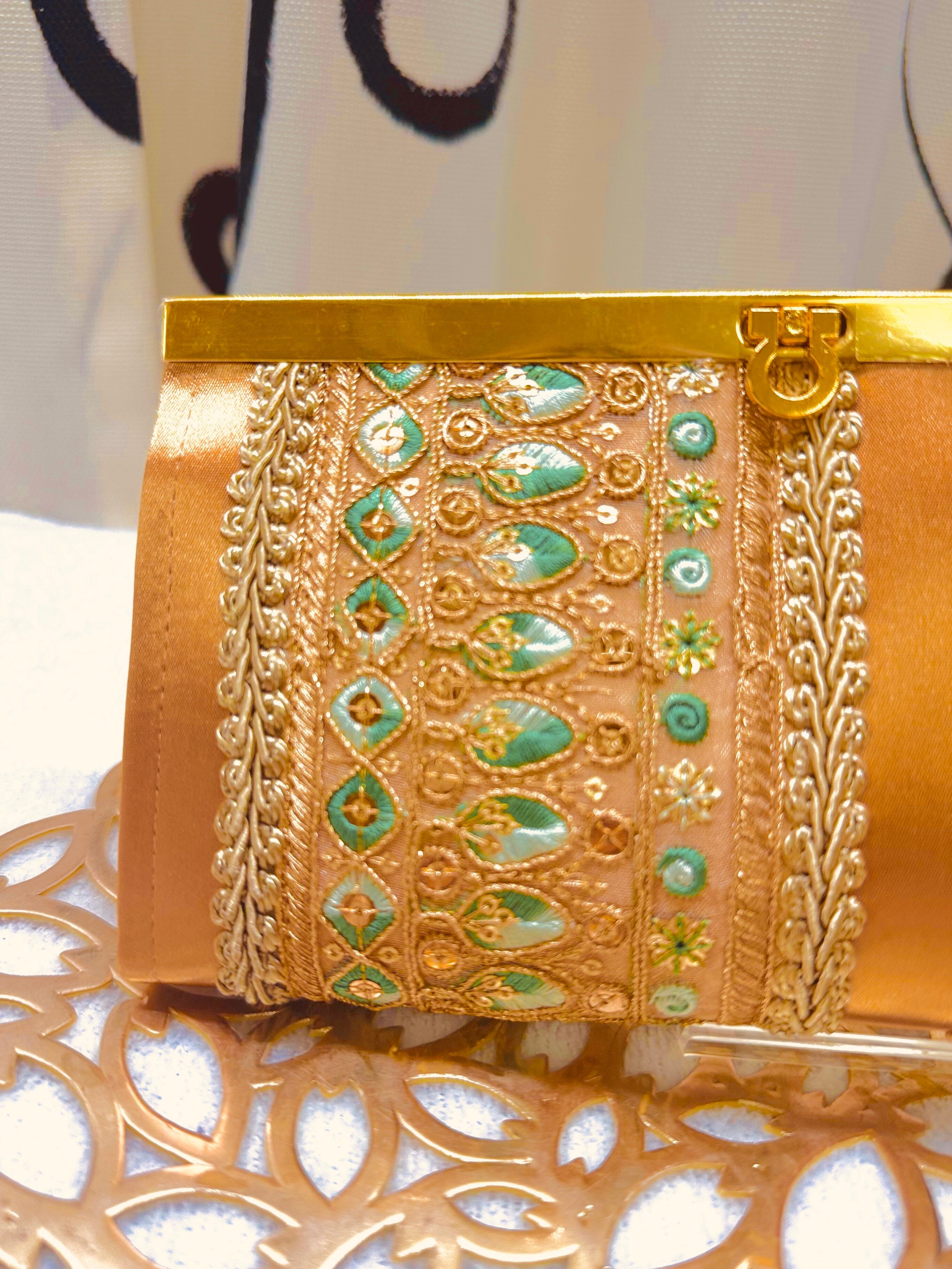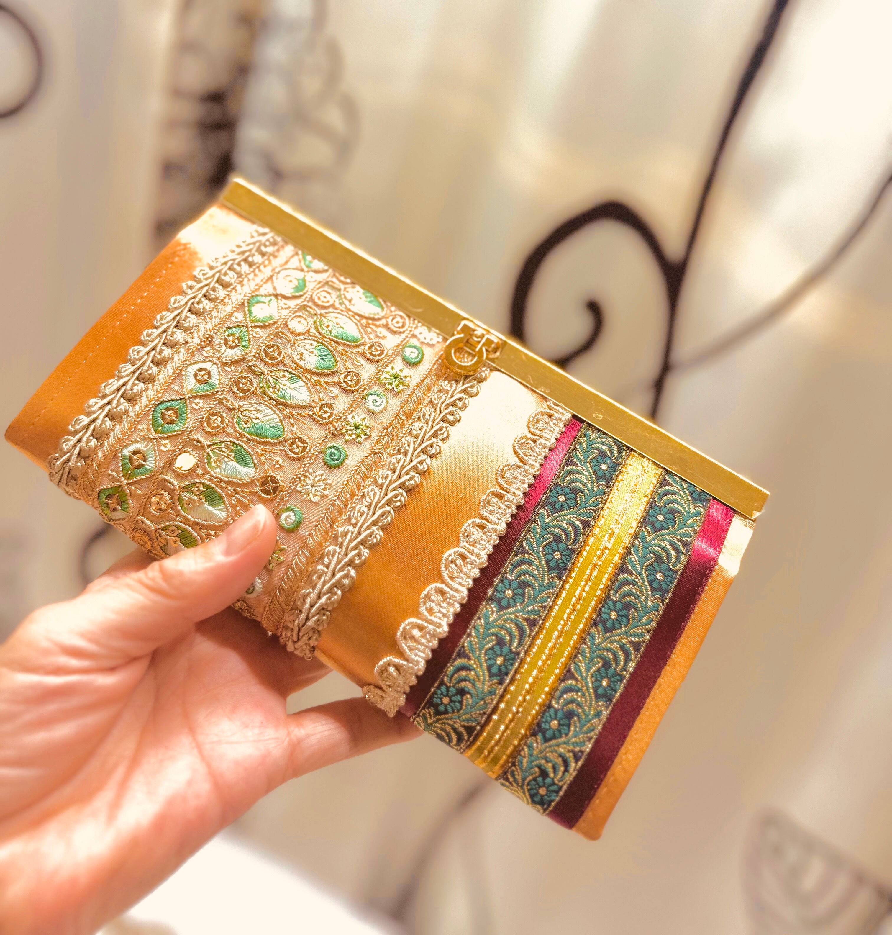美しく可愛いデザインのインド刺繍のリボンと、美しい艶感のあるリボンを一枚一枚厳選し、それらをアレンジして組み合わせる事で、一枚の布として仕上げ、お財布表面のデザインとして形作っています。