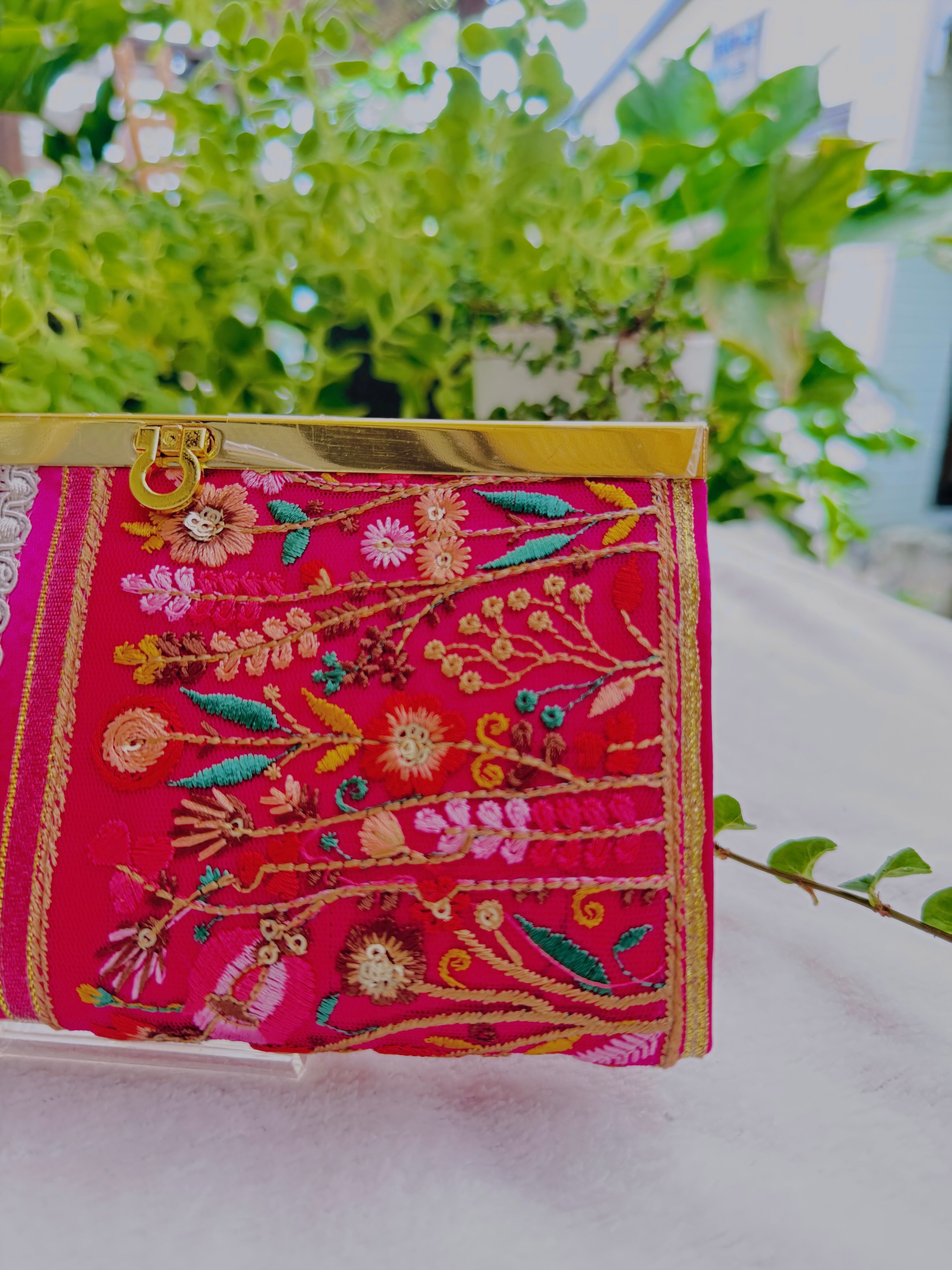 美しく可愛いデザインのインド刺繍のリボンと、美しい艶感のあるリボンを一枚一枚厳選し、それらをアレンジして組み合わせる事で、一枚の布として仕上げ、お財布表面のデザインとして形作っています。