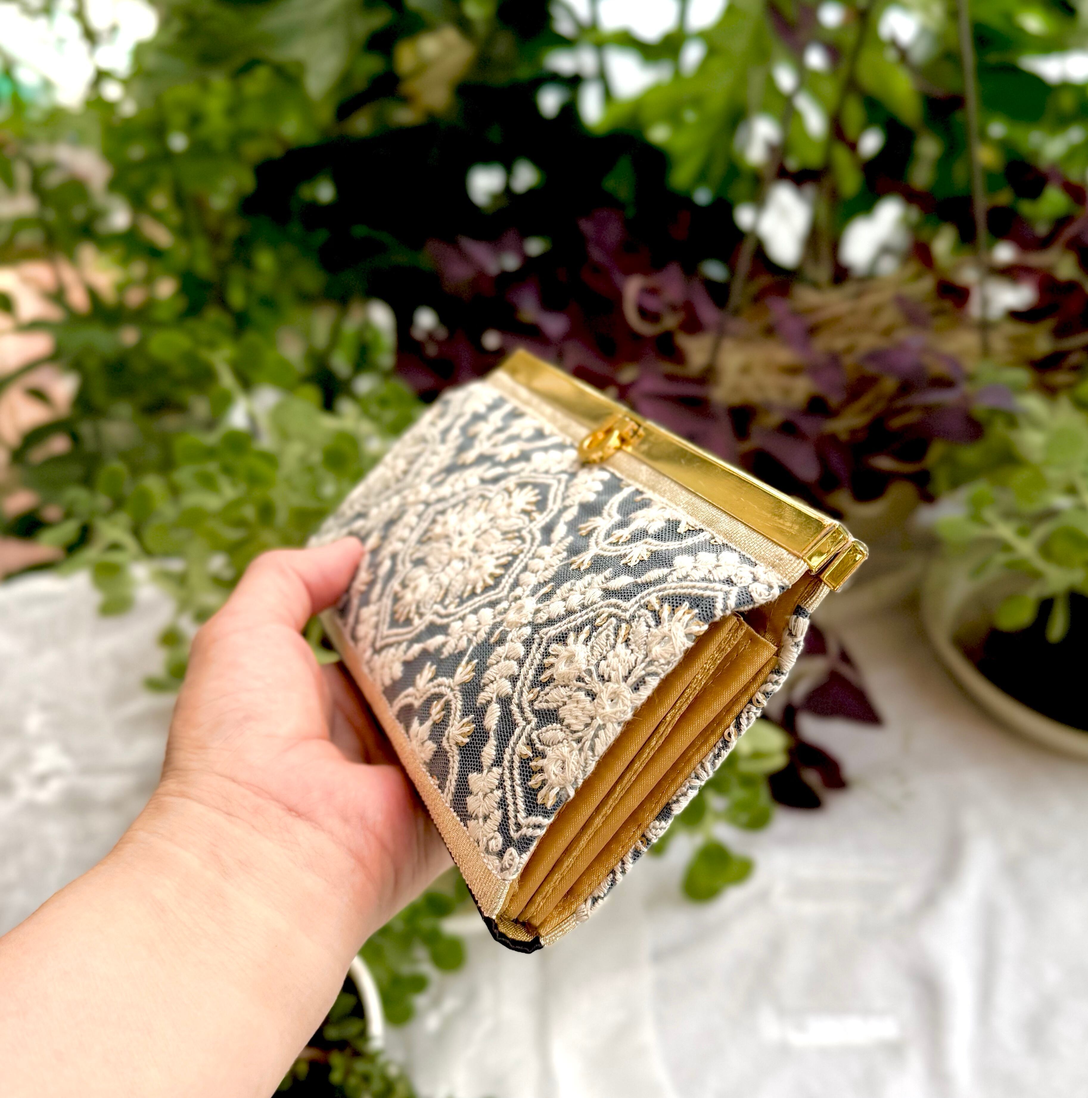 当店では、美しく可愛いデザインのインド刺繍のリボンと、美しい艶感のあるリボンを一枚一枚厳選し、それらをアレンジして組み合わせる事で、一枚の布として仕上げ、お財布表面のデザインとして形作っています。