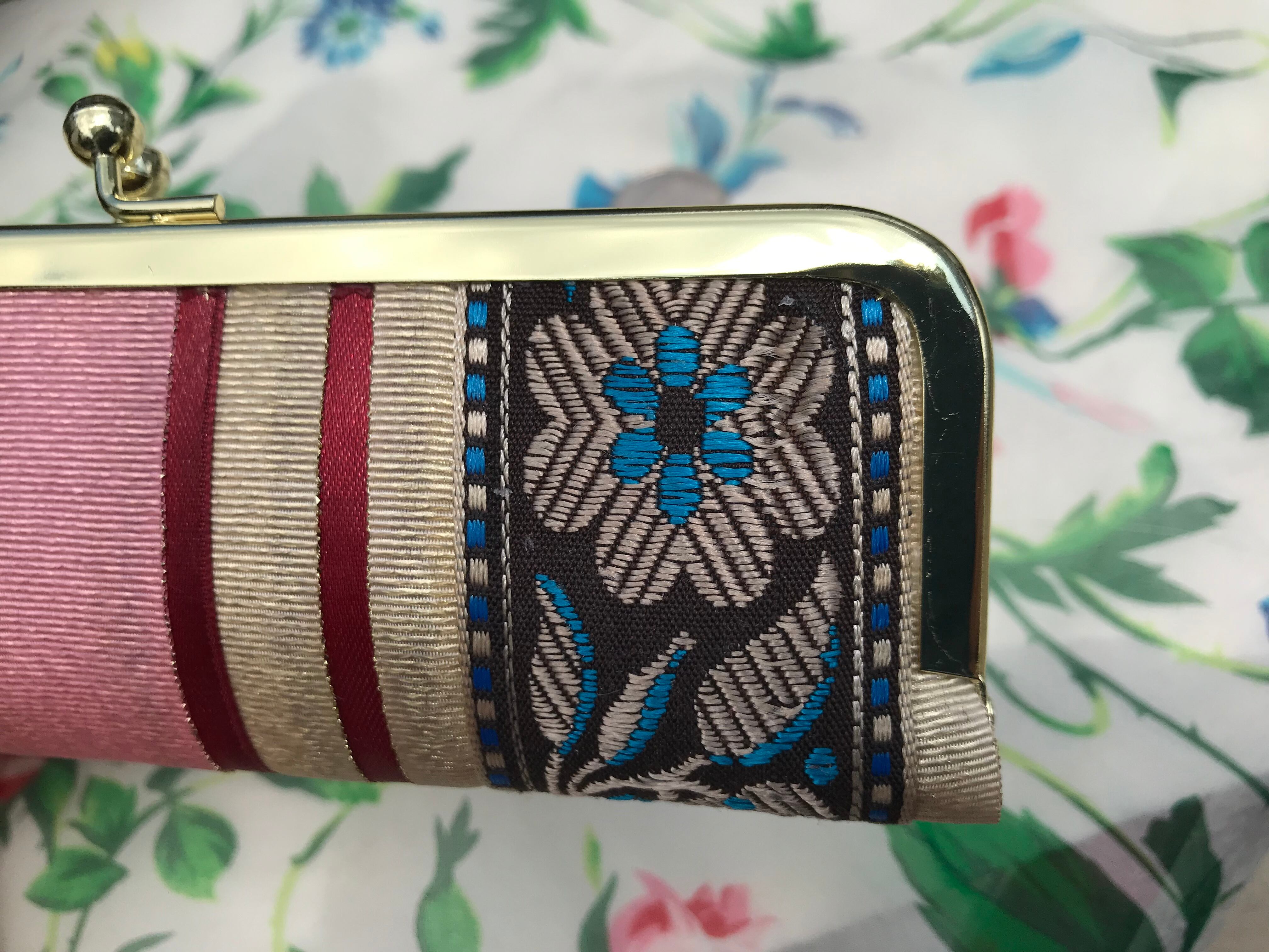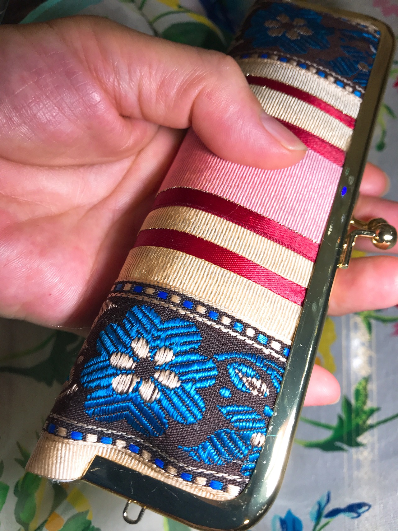 表地は、ハッピーを呼ぶキラキラ光る糸や素材を一枚ずつ丁寧に重ねてあり、シルバーブルーのお花が見る方向によって表情を変えます。そしてそのシルバーブルーのお花を引立てるライトゴールドのテープも中心のピンクのテープも淡く光っていて、シンプルですが飽きが来ないとても手に馴染むデザインになっています。持っていて癒される気がすると仰る方もみえます。