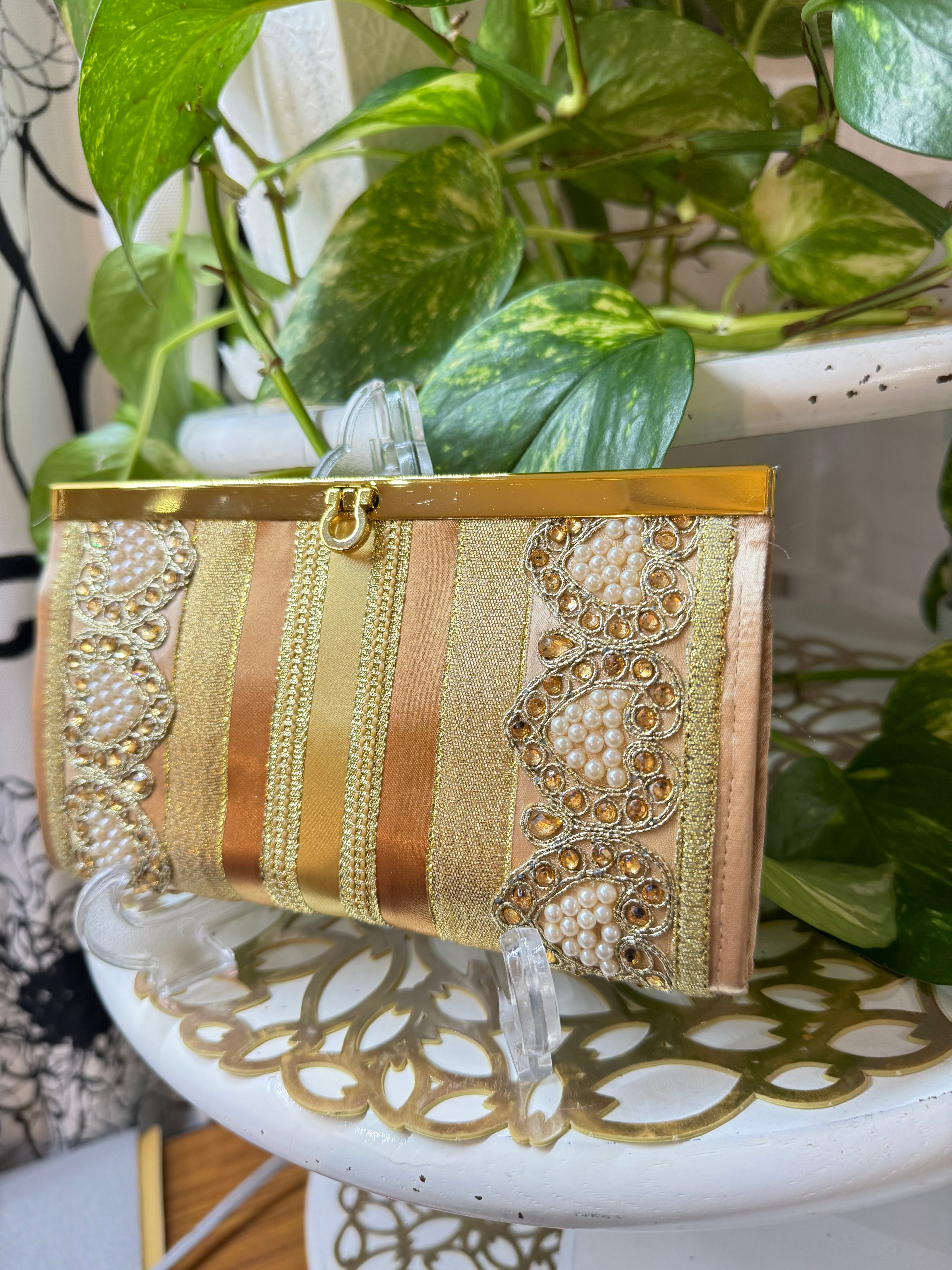 表地はゴールド系のリボンを一本一本ハンドメイドにて組み合わせて一枚布としてデザインした、唯一無二の物で他に同じ物は全くありません。