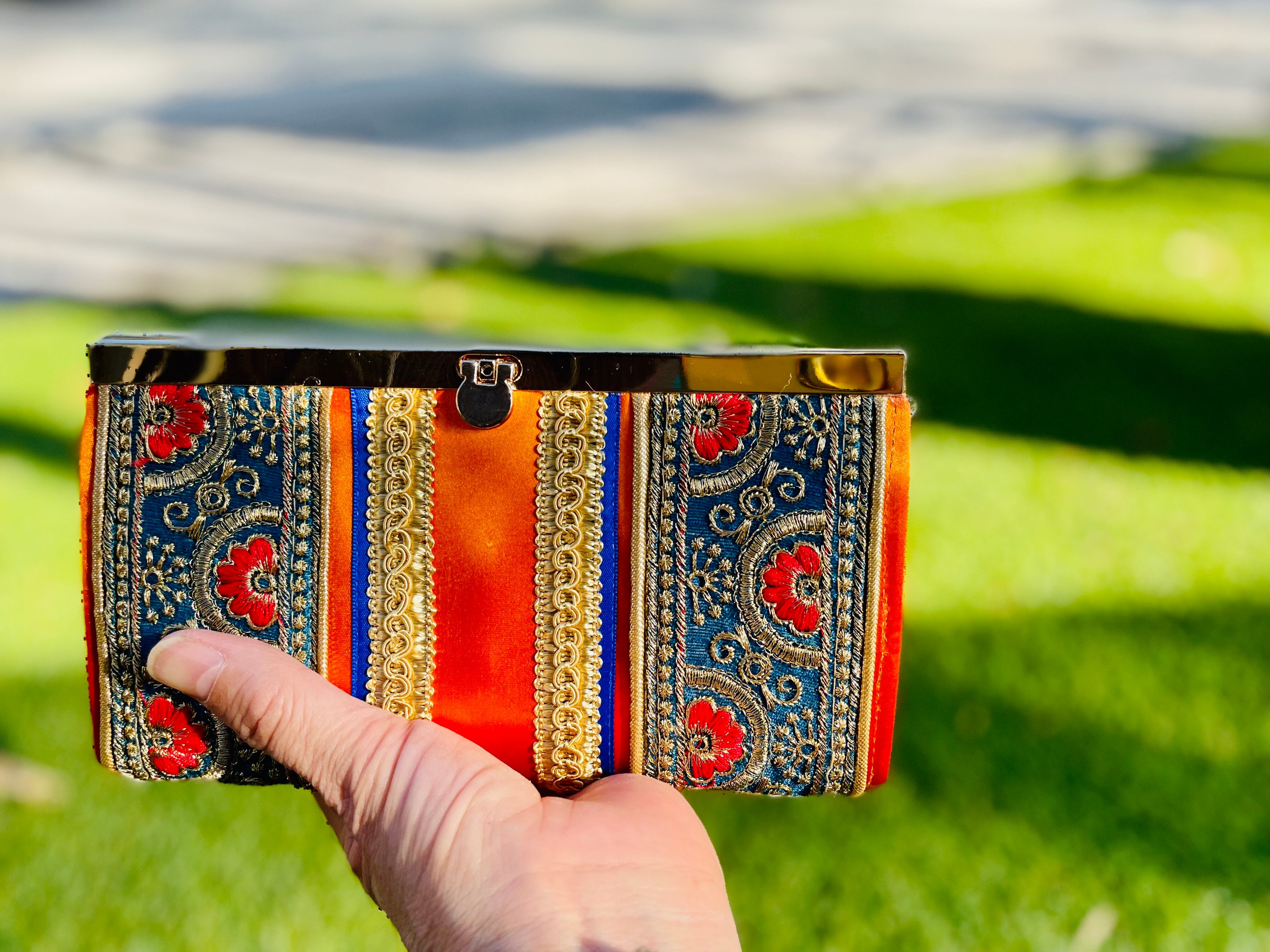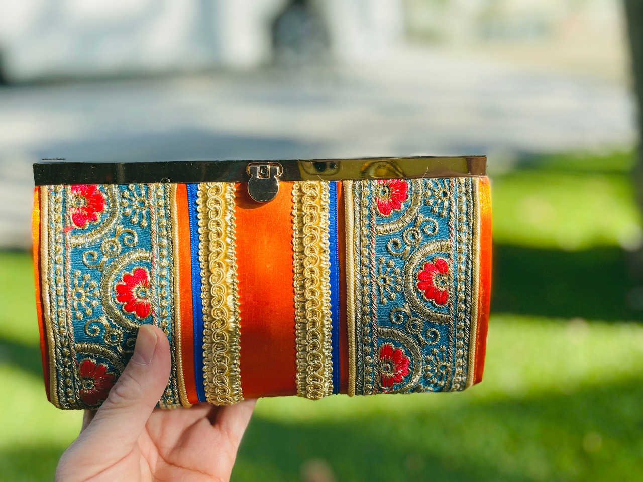 長財布024は、ビタミンカラーのオレンジを土台に、ブルーにオレンジの花と金糸の刺繍を施し、そのリボンの両淵はゴールドカラーのモールがふっくらと可愛い、